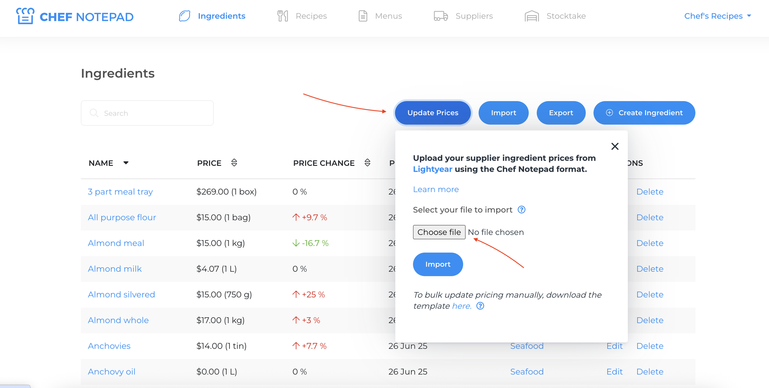 Lightyear doesn’t create ingredients in Chef Notepad, but it updates the price of any ingredient that already exists in your account.